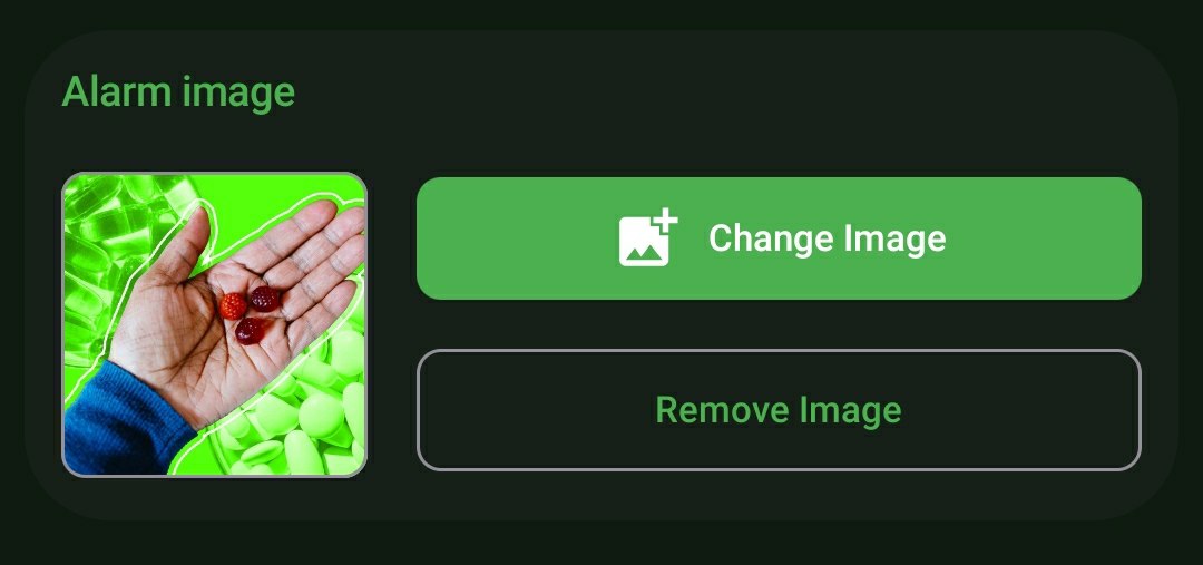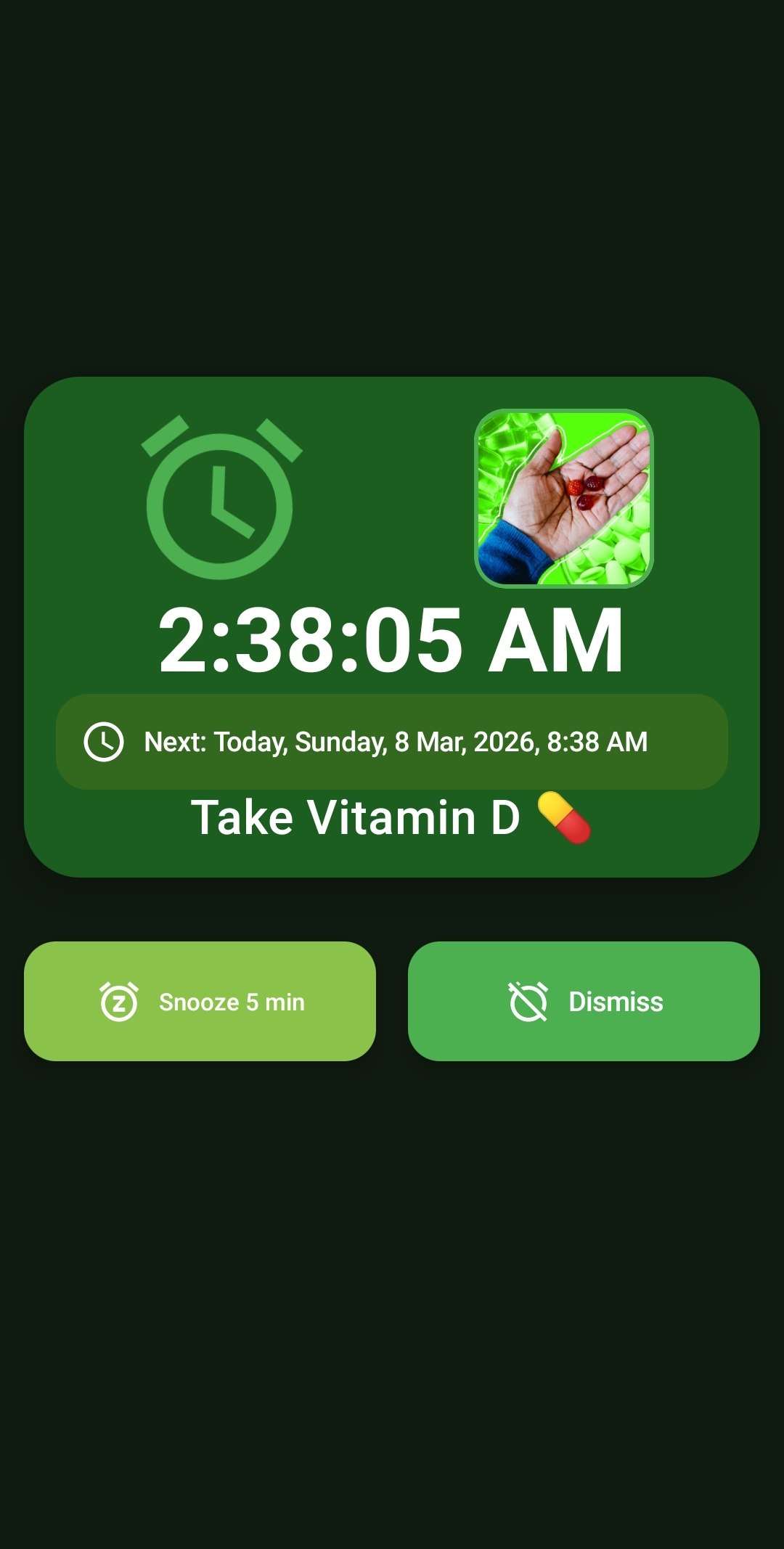 - Prominent Visual Display: The attached image renders prominently alongside the current time and the alarm label (e.g., 'Take Vitamin D') throughout the entire duration of the ringing alarm.