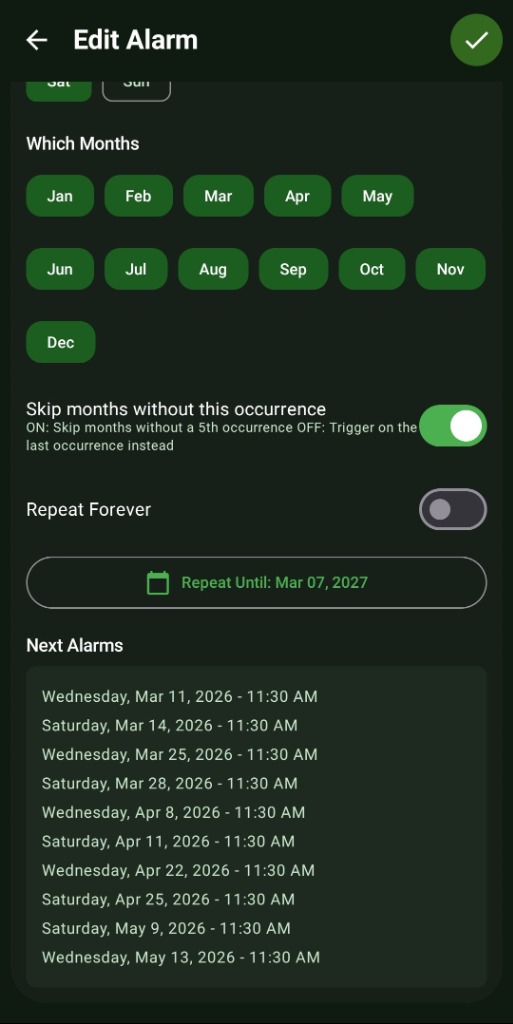 - Targeted Month Filtering: Just like Month-Based alarms, you can isolate these complex ordinal rules to only operate during specific months (e.g., '1st Sunday of June and July').