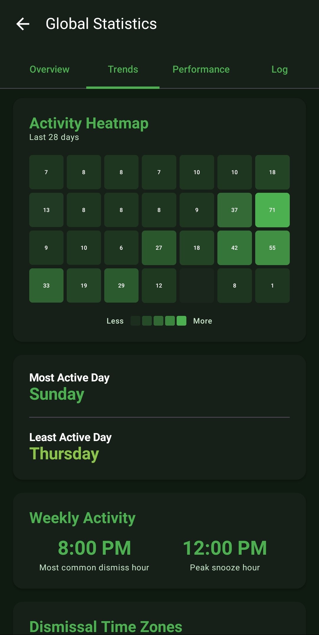 - Trends & Activity Heatmaps: Graphs your Daily Dismissals over a 30-day timeline and constructs an 'Activity Heatmap' visualizing your busiest days over a 28-day grid.
