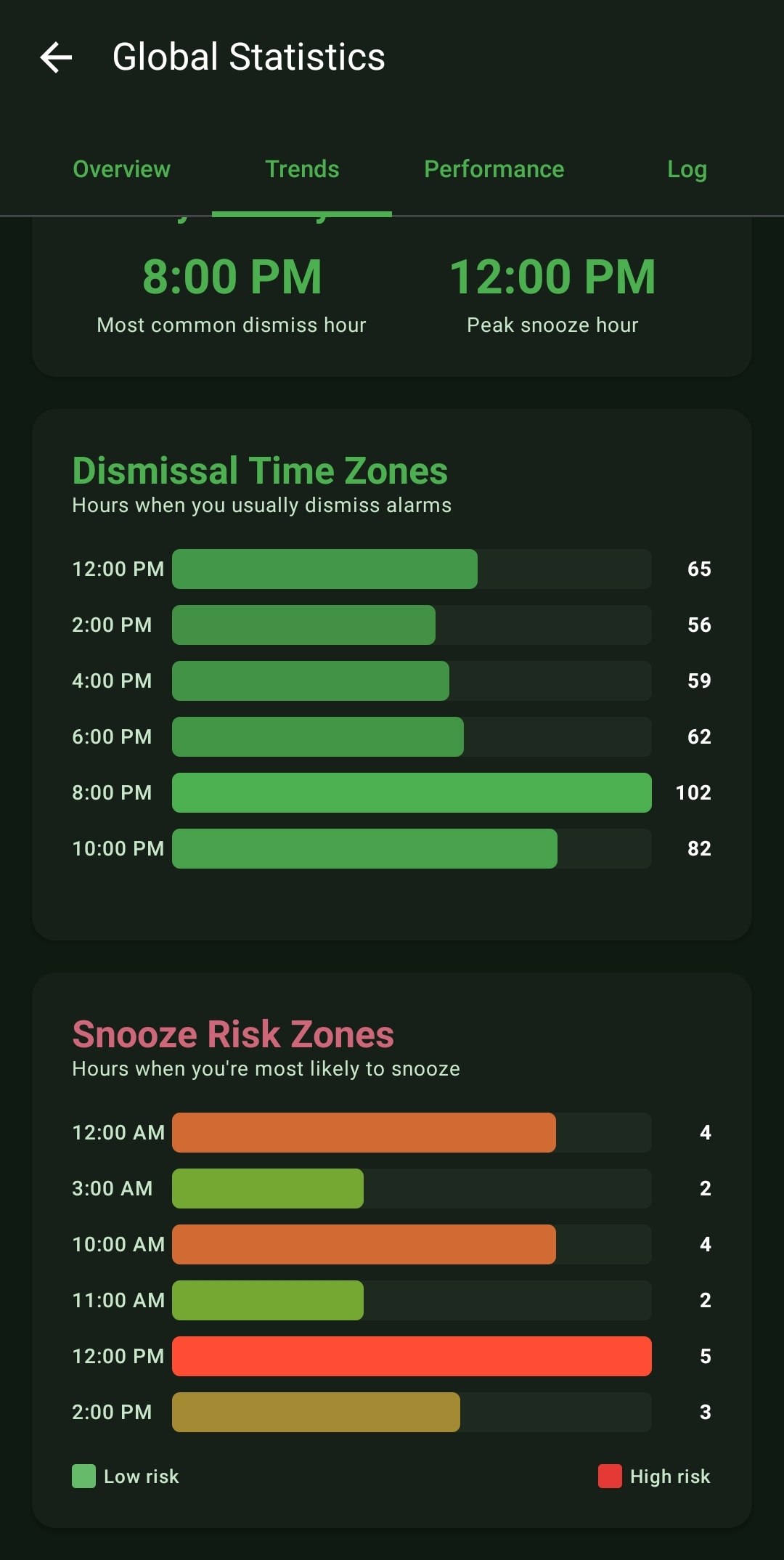 - Snooze Risk Zones: An incredibly powerful trend graph analyzing what precise hours of the day (e.g., 12:00 PM) you are at the highest statistical risk of snoozing, allowing you to prepare mentally.