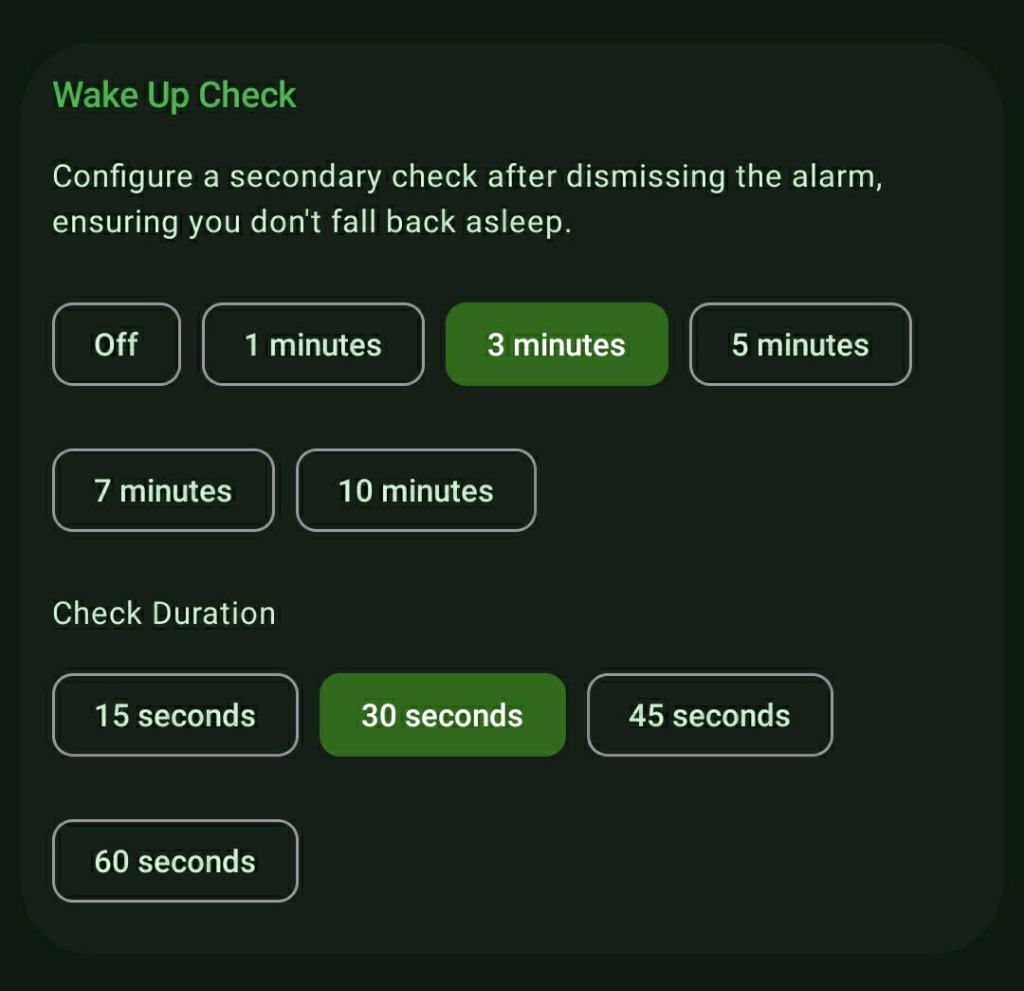 - Select your preferred delay (e.g., check my status 3 minutes after I dismiss the alarm).