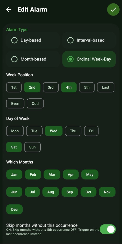 - Smart 5th Occurrence Skipping: Not every month has a 5th occurrence of a specific weekday. The 'Skip months without this occurrence' toggle dictates exactly how the alarm should behave when a 5th week is missing.