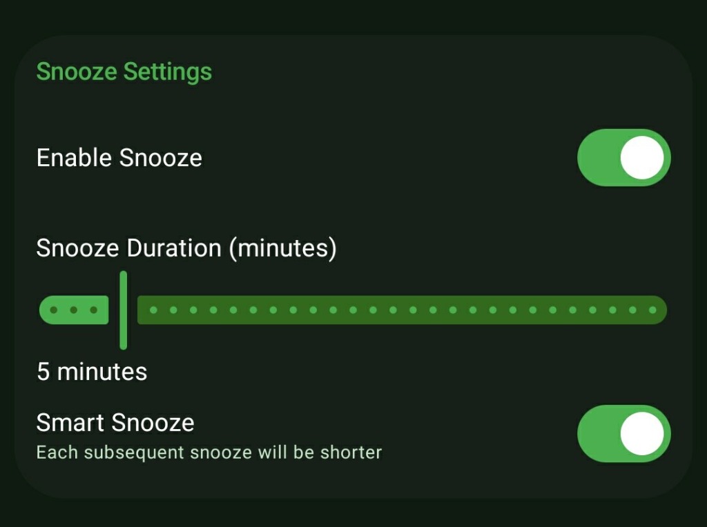 - Algorithmic Interval Reduction: If snooze is enabled, Smart Snooze automatically calculates shrinking time intervals based on your initial starting duration.