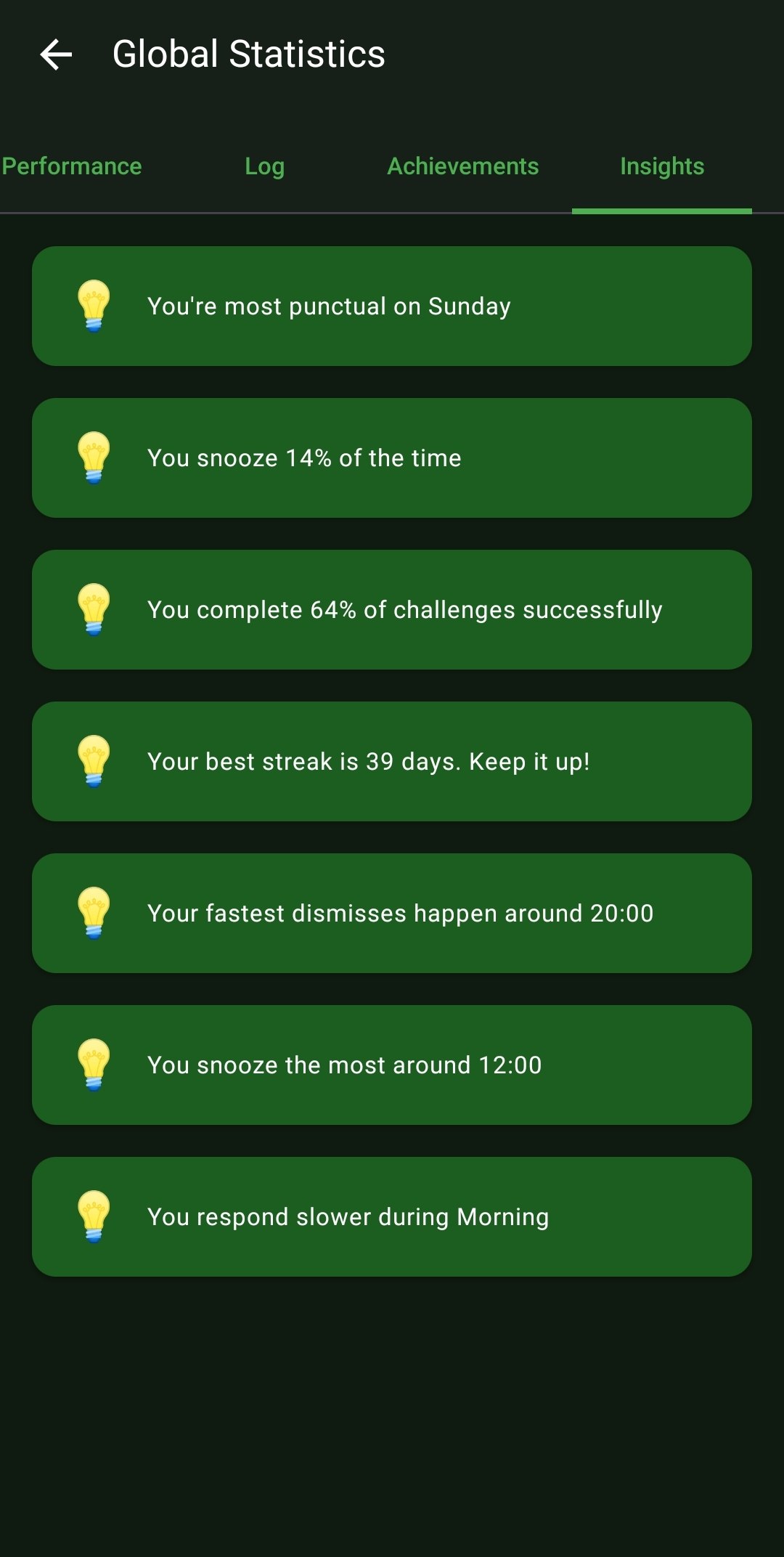 - Textual Intelligence: The 'Insights' tab processes all of this data to give you simple, actionable sentences like: 'You respond slower during the Morning,' or 'You snooze the most around 12:00.'