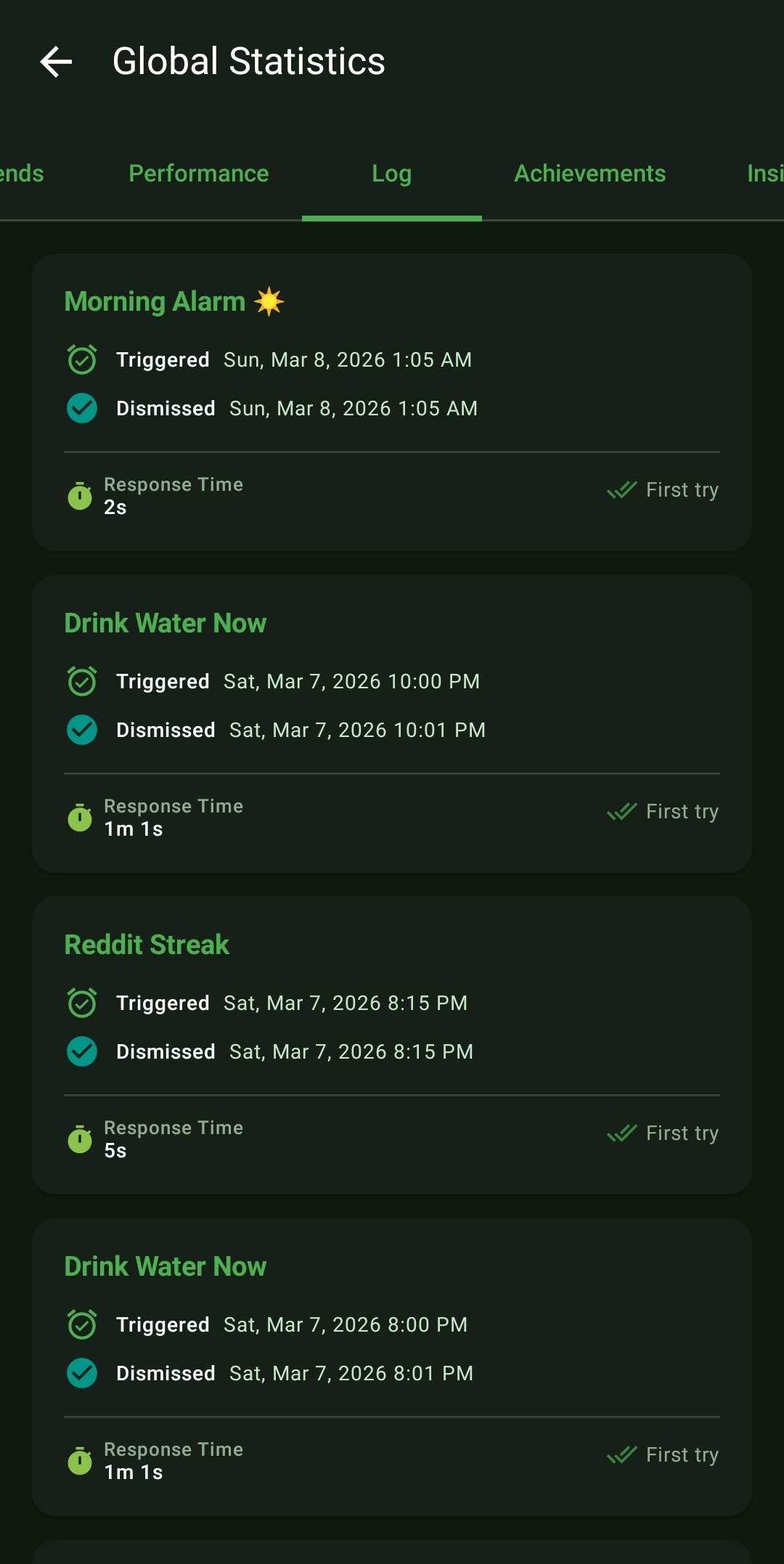 - Deep Performance Analytics: Tracks your First-Try Dismissal Rate, Snooze Frequency, and your exact Average Response Time down to the precise second.