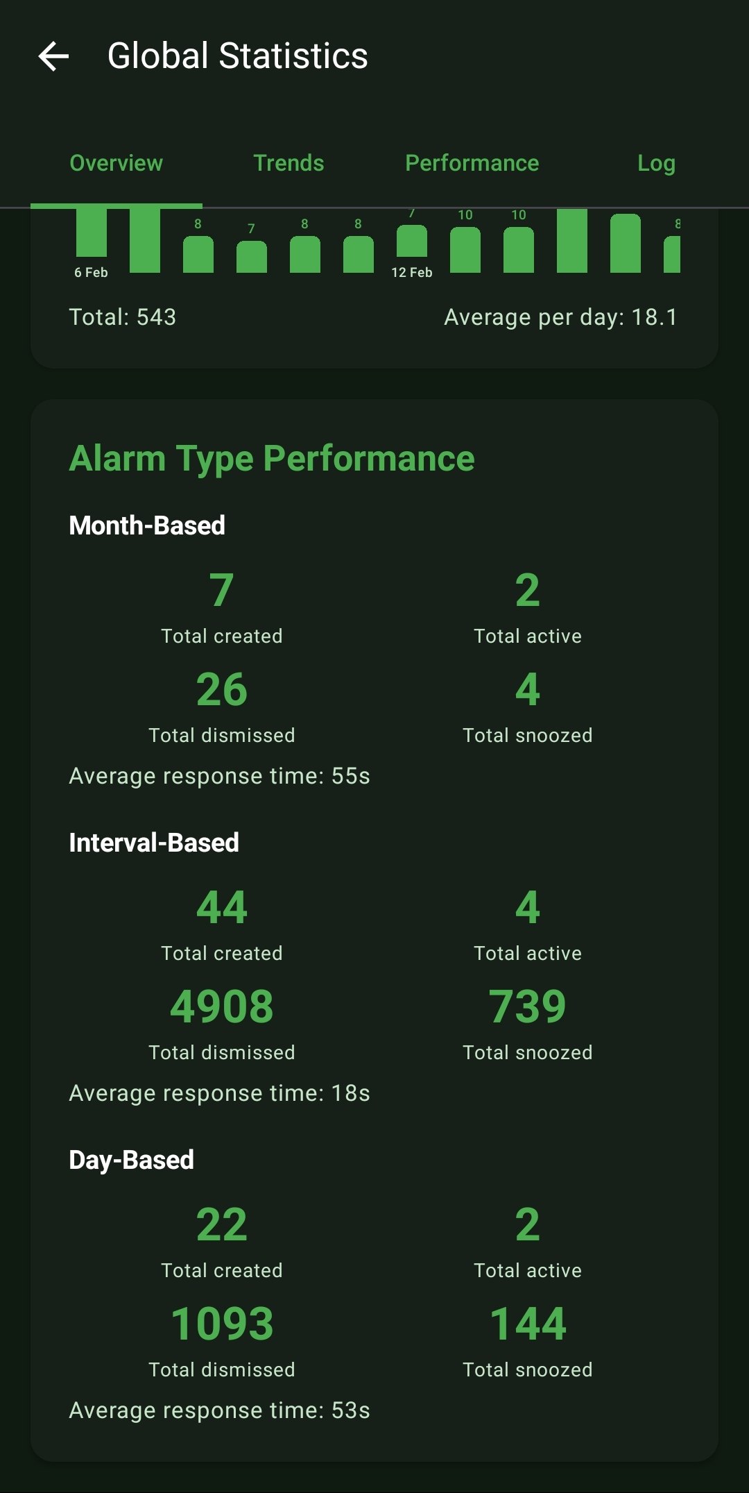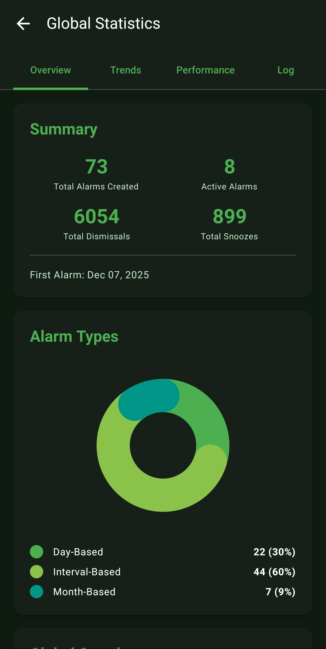 - Alarm Type Breakdowns: Visualizes exactly what types of alarms (Day-Based, Interval-Based, or Month-Based) orchestrate your life via interactive donut charts.