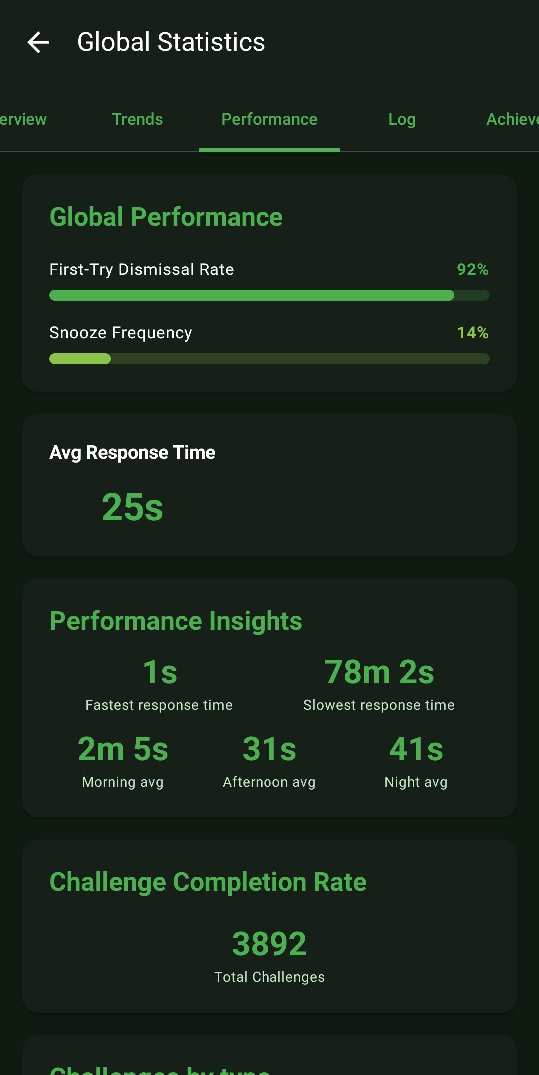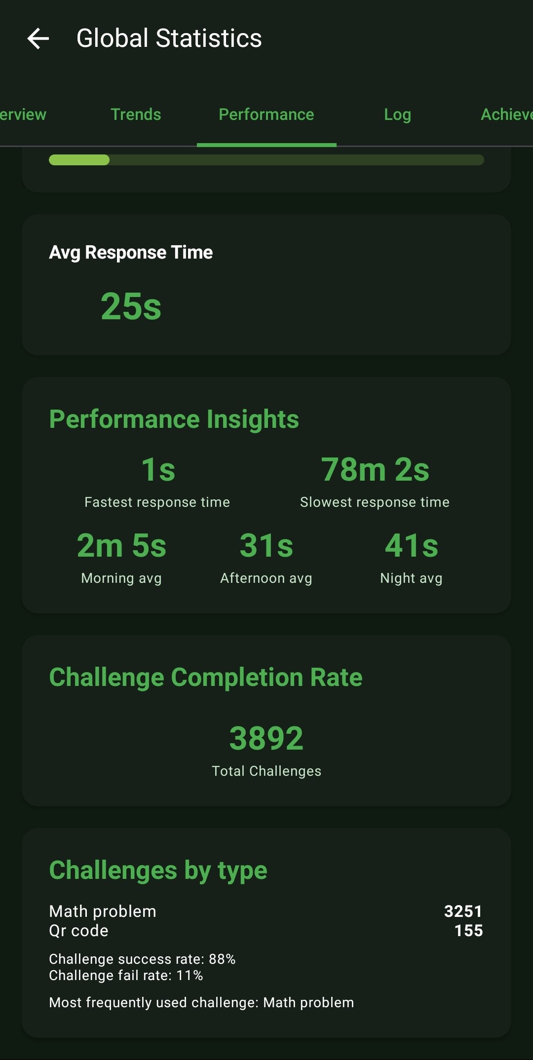 - Challenge Analytics: Monitors your overall Challenge Completion Rate, breaking down exactly which challenge types (e.g., Math vs. QR) you succeed or fail at most frequently.