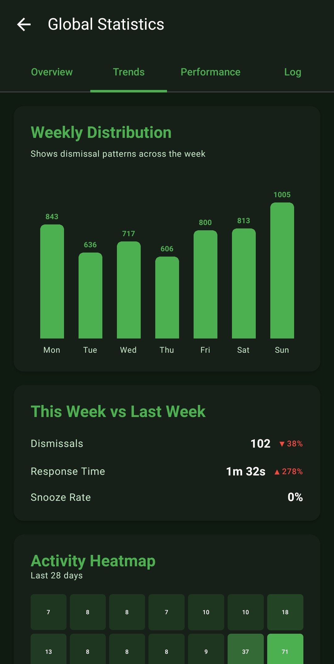 - Trends & Activity Heatmaps: Graphs your Daily Dismissals over a 30-day timeline and constructs an 'Activity Heatmap' visualizing your busiest days over a 28-day grid.