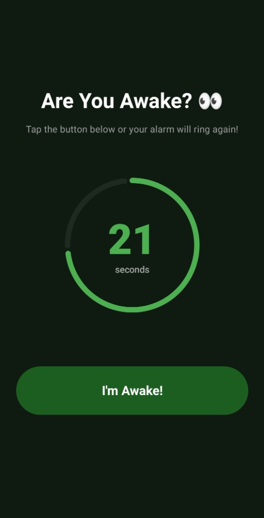 - Strict Response Timers: Define a 'Check Duration' (15, 30, 45, or 60 seconds). You must tap the 'I'm Awake!' button within this brief window, or the alarm resounds.